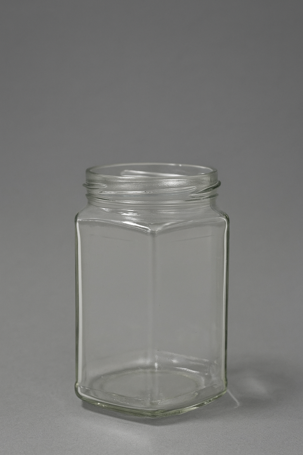Skaidraus stiklo šešiakampio formos stiklainis.
